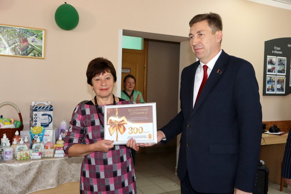 В рамках благотворительной акции "С добром и уважением" отделение обеспечения круглосуточного пребывания для граждан пожилого возраста и инвалидов ЦСОН Зельвенского района посетили председатель Гродненского областного объединения профсоюзов Виктор Андреевич Лискович, руководство района во главе с председателем райисполкома Денисом Александровичем Ольшевским и председатель Гродненской областной организации Белорусского профсоюза работников культуры, информации, спорта и туризма Денис Викторович Малевич.